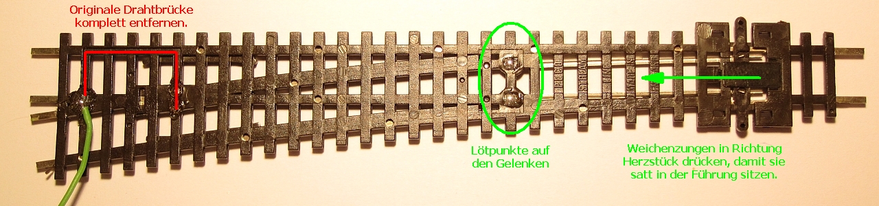 - Lötpunkte an den Gelenken setzen, dort werden auch die Kabel (geradeaus/abzweigend) angelötet (gleichzeitig werden auch die Weichenzungen bei neueren Peco-Jahrgängen in den Führungen gehalten, wenn die Feder fehlt)