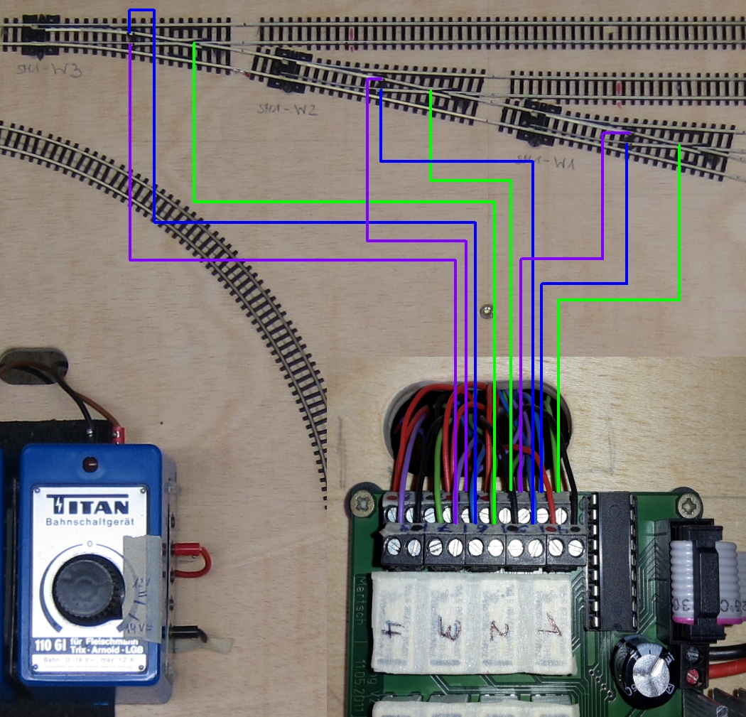 Das Besondere bei einer DKW ist, dass die Zungen einmal als "abzweigend" und einmal als "geradeaus" angeschlossen werden müssen. Deshalb sind je ein Pärchen blau/lila zusammengefasst und entsprechend mit der Relaiserweiterung verbunden.