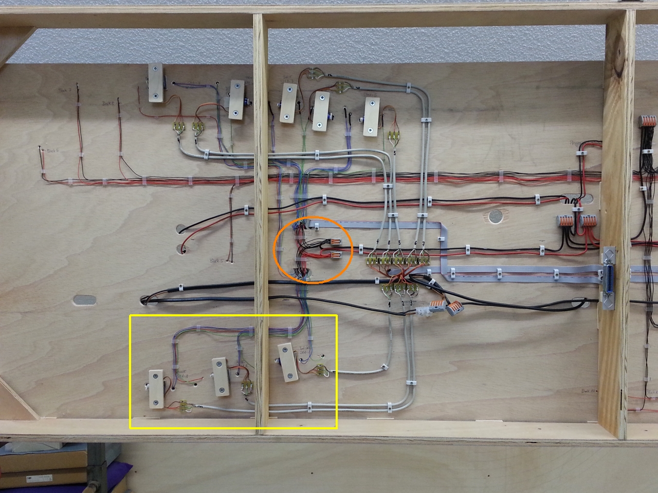 Die Relaiserweiterung gibt ja die Gleisspannung an die Weichen weiter, diese erhält sie vom Verteiler (Wago-Klemmen), der direkt mit der Zentrale verbunden ist (oranger Kreis)