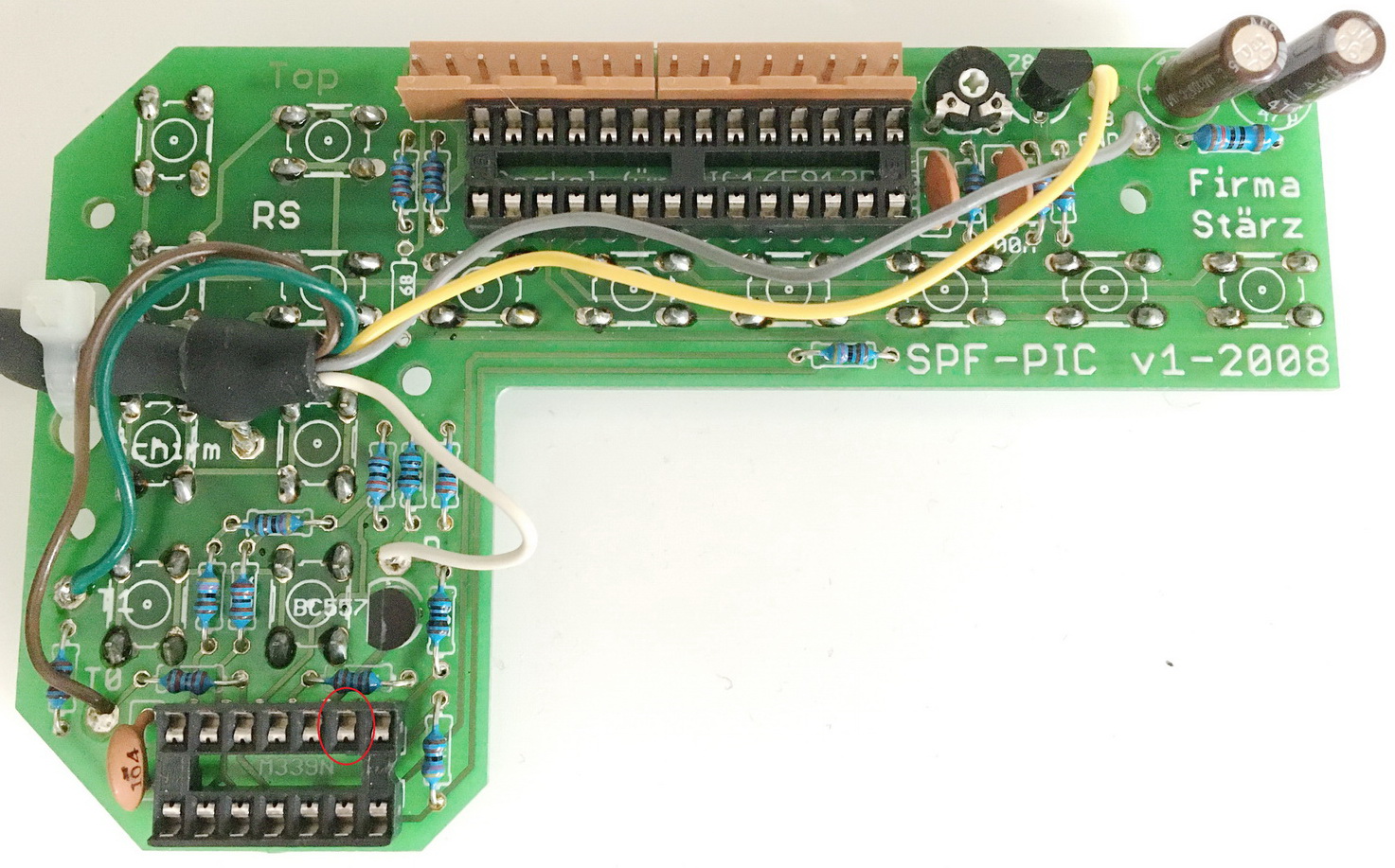 Bitte schauen Sie auf der Platine nach dem Sockel und dem roten Kreis (Siehe Foto) und Version v1-2008.